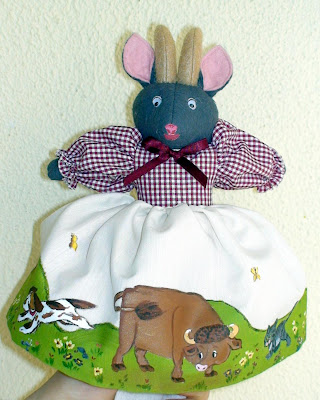 A saia tem pintada a Cabana as Montanhas o Joseph e a Cabrinha Marota. Do outro lado o Avôzinho